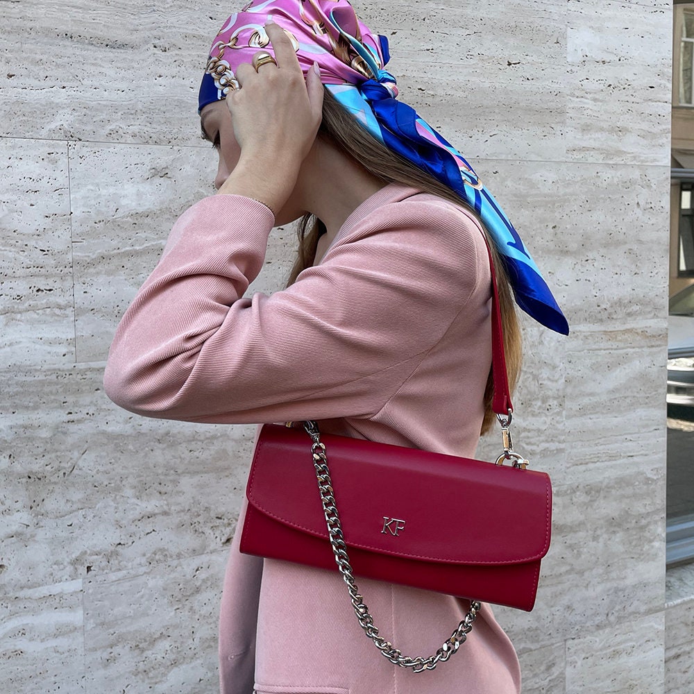 Red genuine leather woman shoulder bag from Ukrainian designer Katerina Fox. Fashionable and elegant modern bag KF for bright girls and women. This bag is able to attract attention and highlight your exquisite taste. Inside the bag is one compartment and a convenient zippered pocket for small items closes the bag on the button magnet. The bag is comfortable to wear on the shoulder or the wrist.