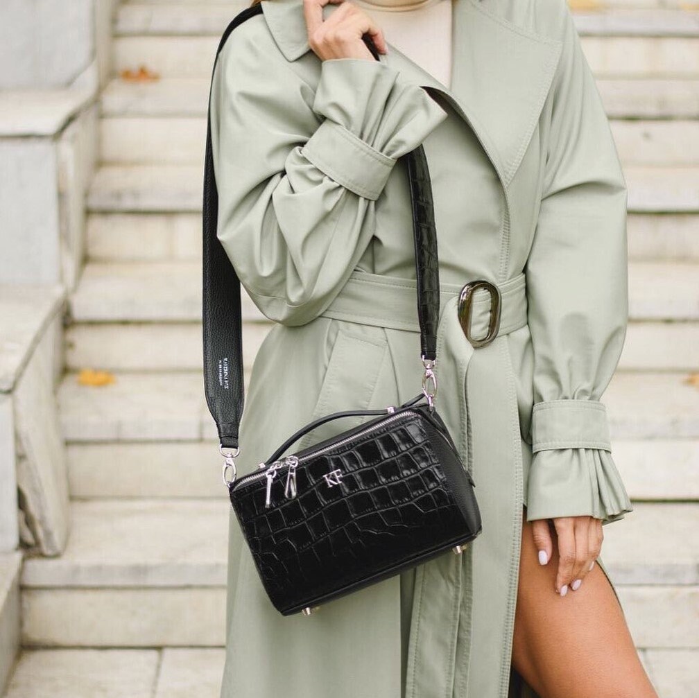 Black genuine leather woman shoulder bag from ukrainian designer Katerina Fox. Fashionable and elegant modern bag KF for bright girls and women. This bag is able to attract attention and highlight your exquisite taste. The internal space of a bag is equipped with one spacious compartment and one zipper pocket. The bag is closed with a zipper. The length of the strap is not adjustable. The kit also includes a storage bag.