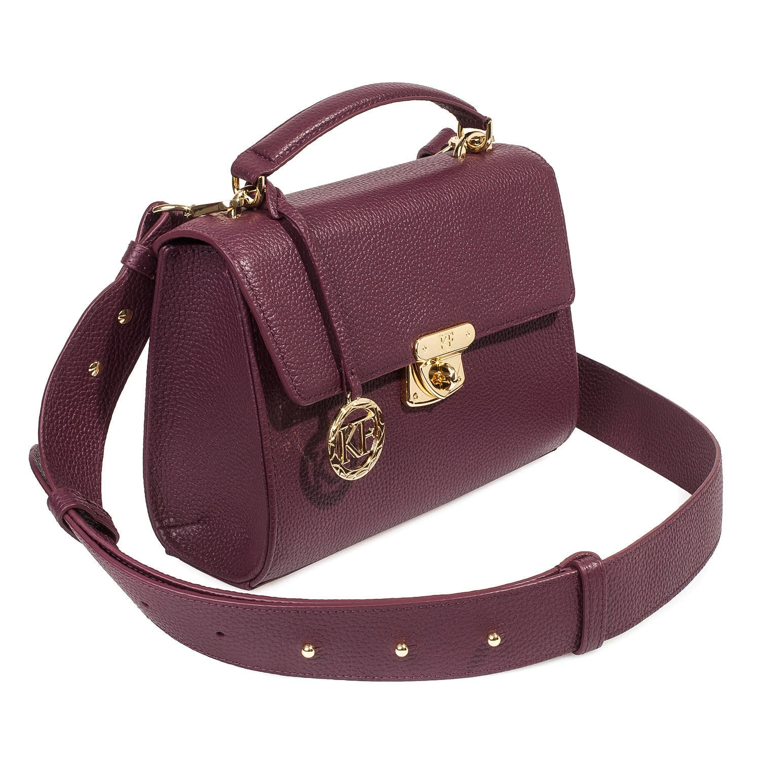 Blackberry genuine leather handbag from Ukrainian designer Katerina Fox. The internal space of a bag is equipped with three spacious compartments and two patch-pockets and one zipper pocket. One of the spacious compartments is closed with a zipper. The bag is closed with a clasp. The bottom of the bag is protected with metal legs. There is a long handle that allows you to wear the bag on the shoulder. The kit also includes a storage bag.