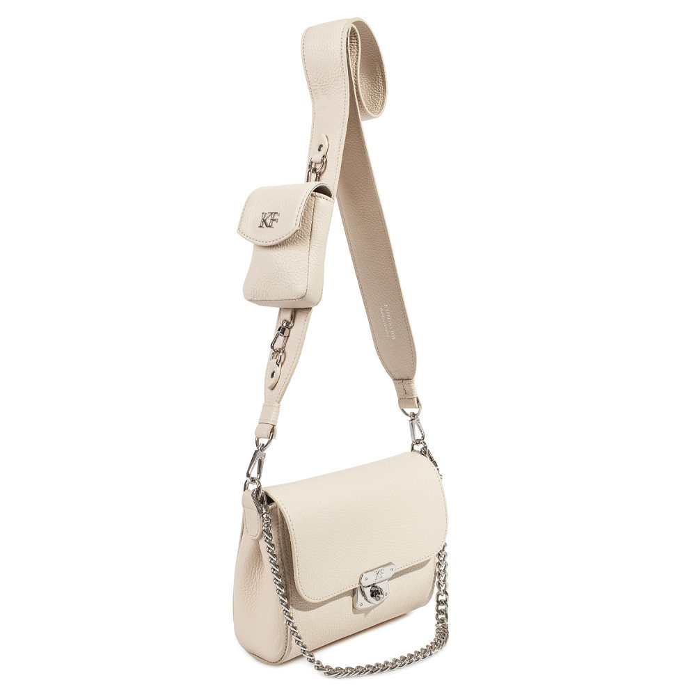 Light beige genuine leather woman shoulder bag from ukrainian designer Katerina Fox. Fashionable and elegant modern bag KF for bright girls and women. This bag is able to attract attention and highlight your exquisite taste. Inside the bag is one large compartment and a convenient zippered pocket for small items, closes the bag on the clasp. The bag is comfortable to wear on the shoulder or across the shoulder. If you are planning to buy excellent leather bag at an affordable price, this handbag is the right choice!