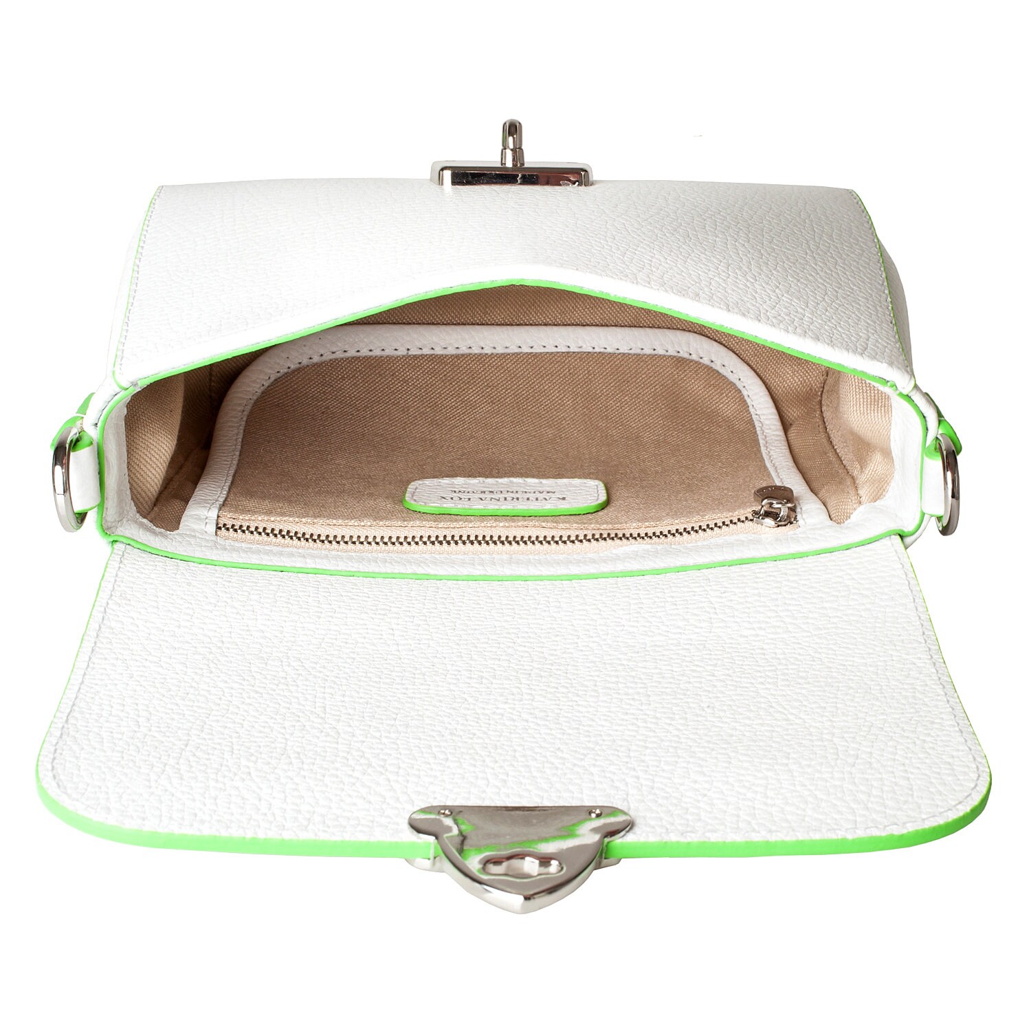 White genuine leather woman shoulder bag from ukrainian designer Katerina Fox. Fashionable and elegant modern bag KF for bright girls and women. This bag is able to attract attention and highlight your exquisite taste. Inside the bag is one large compartment and a convenient zippered pocket for small items, closes the bag on the clasp. The bag is comfortable to wear on the shoulder or across the shoulder.